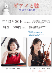 ピアノと弦 【12月の音の贈り物】 2025年12月20日(土曜日) 14:00開演(開場13:30)東御市文化会館ロビー 料金:500円(税込)チケットは発行しておりません。当日先着順となります。 [ピアノ]深沢 雅美 … 続きを読む