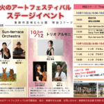 10月11日(土曜日)~12日(日曜日) 場所:東御市芸術村公園内 特設ステージ 今年も豪華絢爛アーティストの競演! どうぞお見逃しなく!