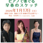 2本のクラリネットとピアノで奏でる早春のスケッチ 2026年1月17日(土曜日) 開場:13:00 開演:13:30 東御市文化会館ロビー入場料金:500円 チケットはありません。当日は先着順となります。(100席程度) … 続きを読む