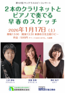 2本のクラリネットとピアノで奏でる早春のスケッチ 2026年1月17日(土曜日) 開場:13:00 開演:13:30 東御市文化会館ロビー入場料金:500円 チケットはありません。当日は先着順となります。(100席程度) … 続きを読む